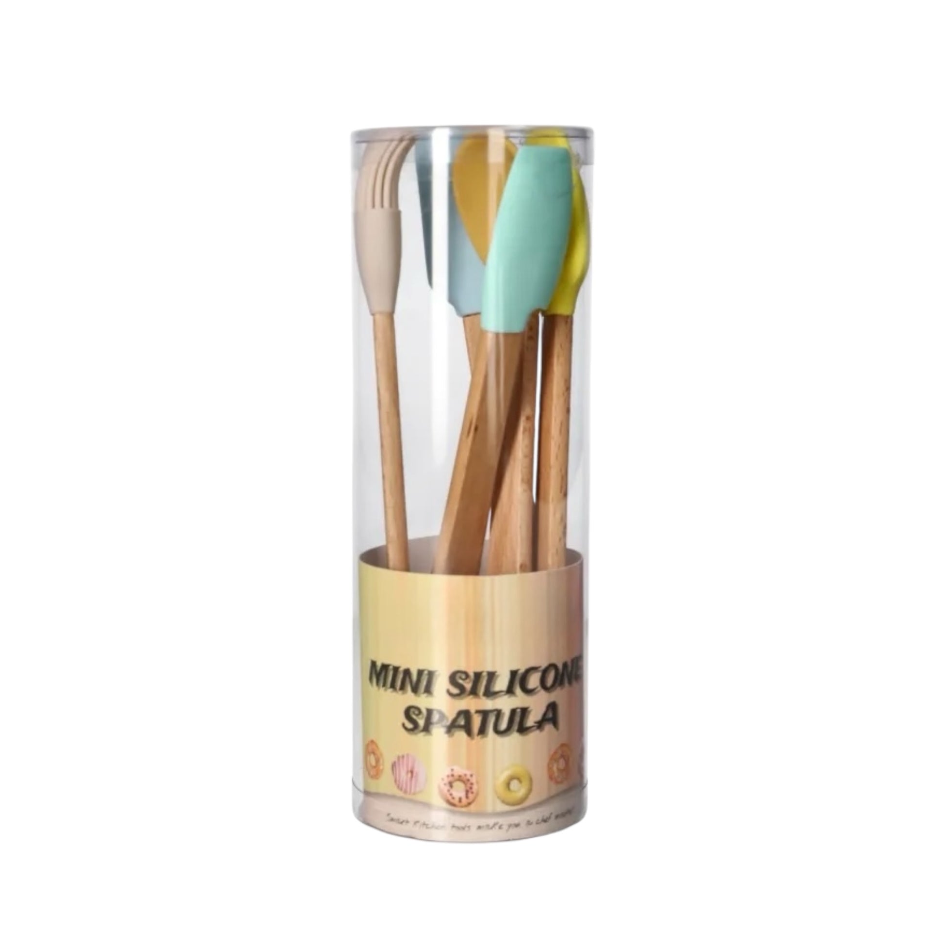 This 5-Piece Mini Silicone Baking Spatula Set features food-grade silicone heads paired with natural bamboo handles for comfortable, precise use. The compact size makes each utensil ideal for mixing, scraping, glazing, and baking in smaller bowls and containers.