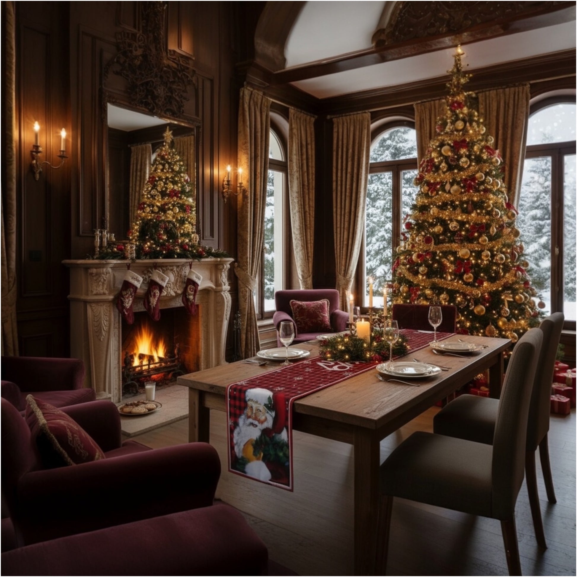 At 30 × 180 cm, it drapes across your table like the beginning of a story: Santa, smiling warmly, surrounded by classic red-and-black festive checks, snowflakes, holly, and vintage holiday charm.