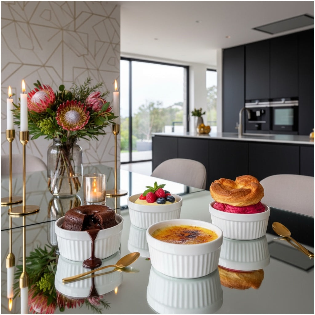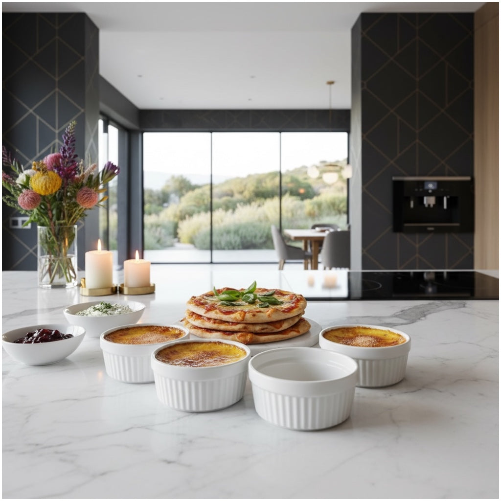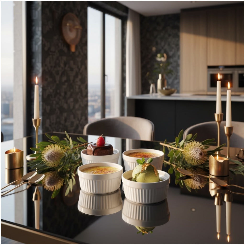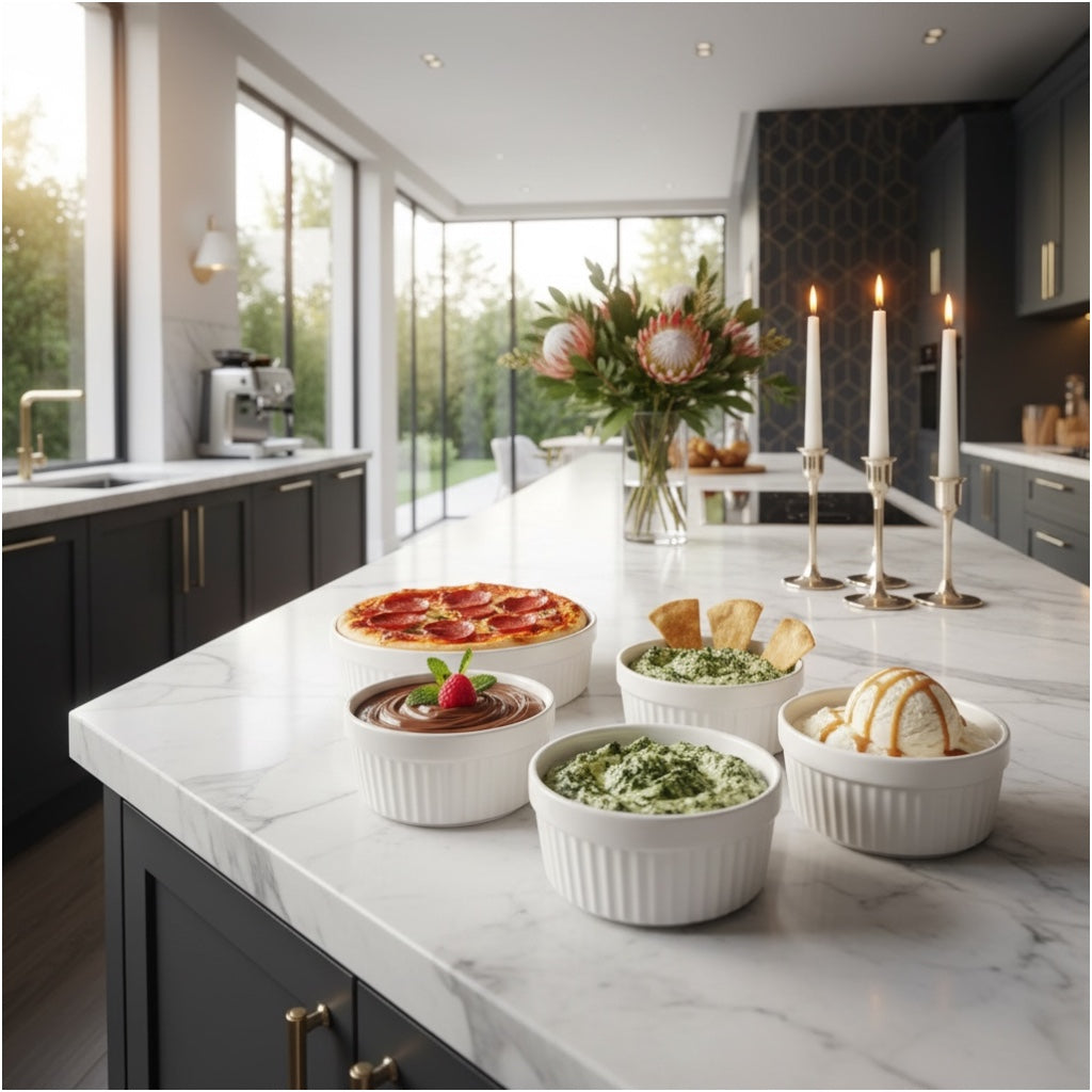 Made from durable, food-safe porcelain, each ramekin is suitable for baking, serving, and storing a wide variety of foods. Ideal for custards, crème brûlée, dips, dressings, ice cream, desserts, cream cheese, and individual cake portions. The compact size makes them perfect for single servings and stylish presentation.