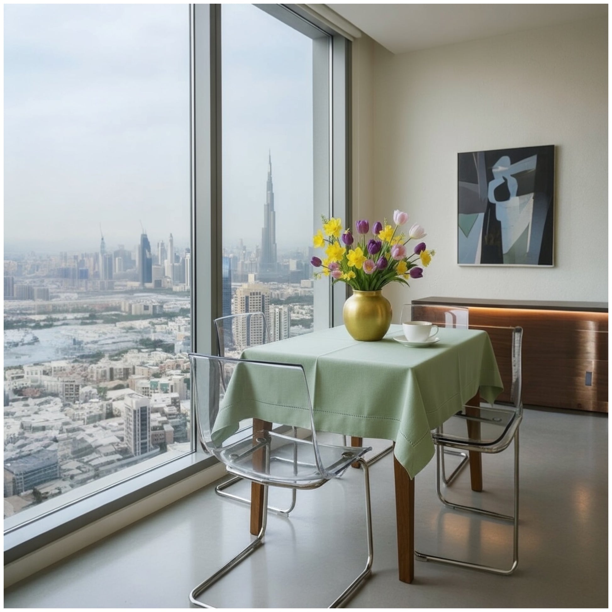Stylish and protective sage green tablecloth for everyday use or special occasions.