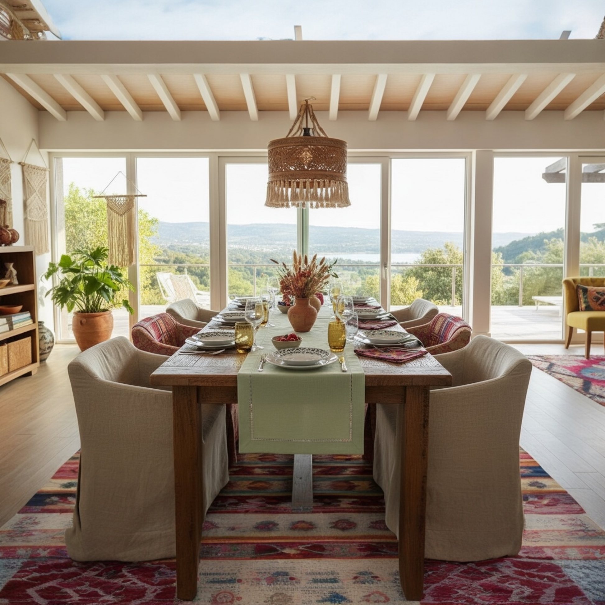 Boho: Rattan décor, patterned napkins, earthy tones
