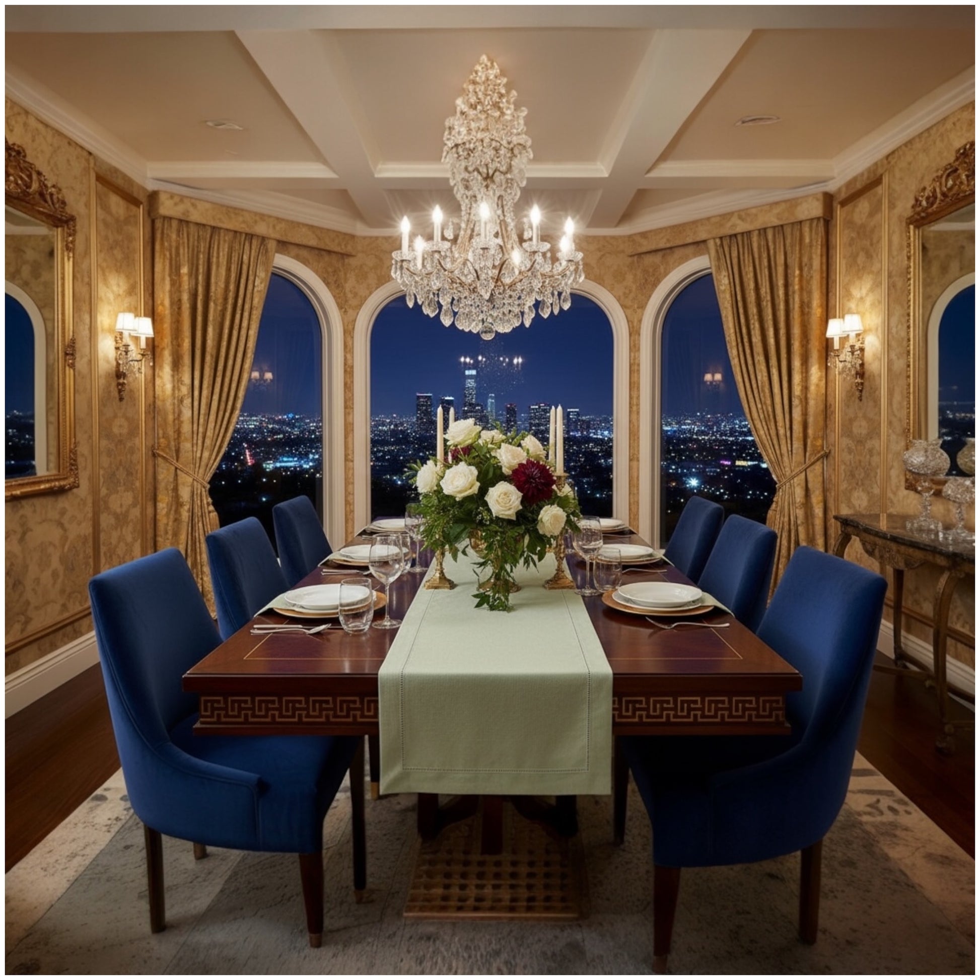 Luxury: Crystal chandeliers, gold chargers, velvet chairs