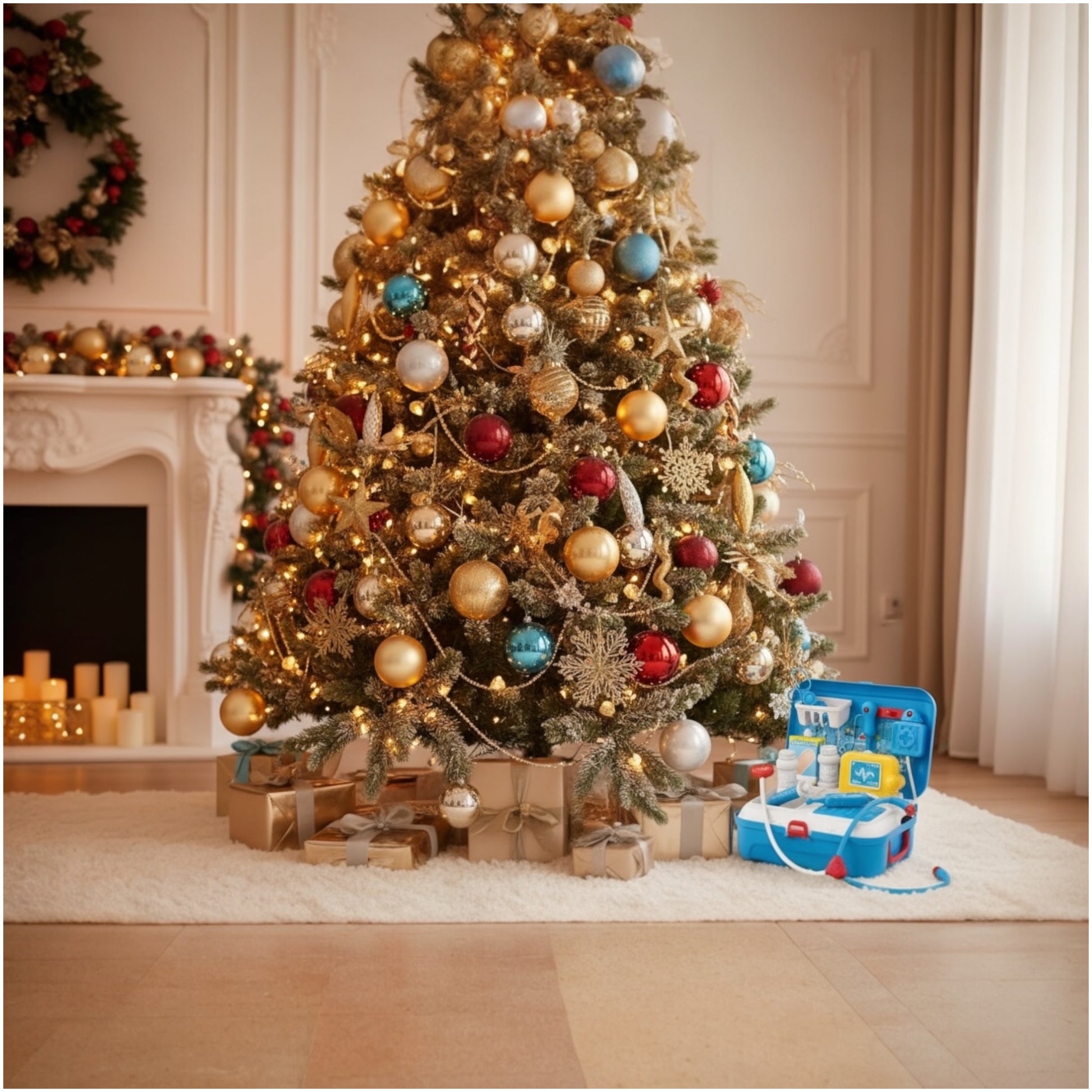 Designed as a bright blue backpack-style medical kit, it opens into a complete mini “clinic” with everything a young doctor needs — from a stethoscope and syringe to band-aids, medicine bottles, thermometer, and more.