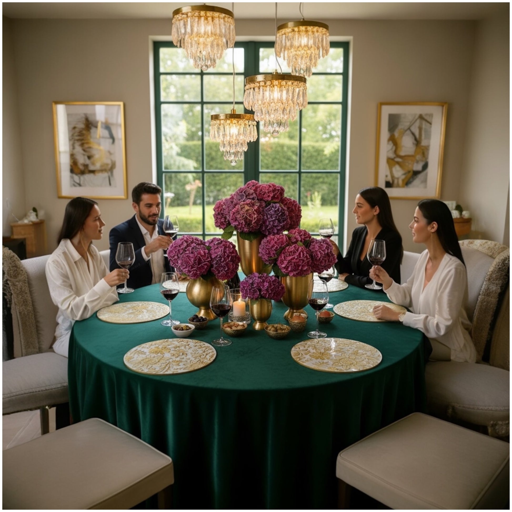 Velvet or linen tablecloths in emerald, ivory, or charcoal tones