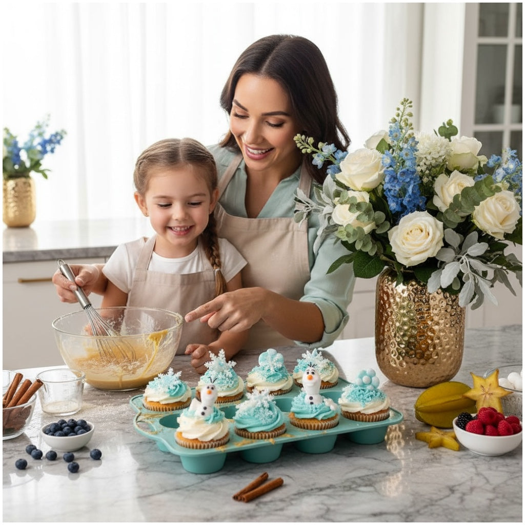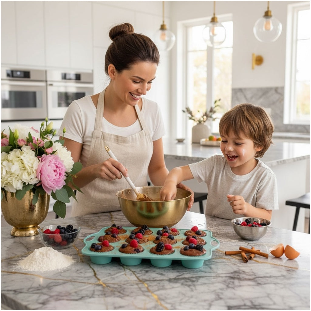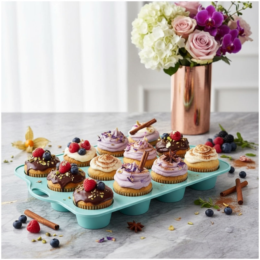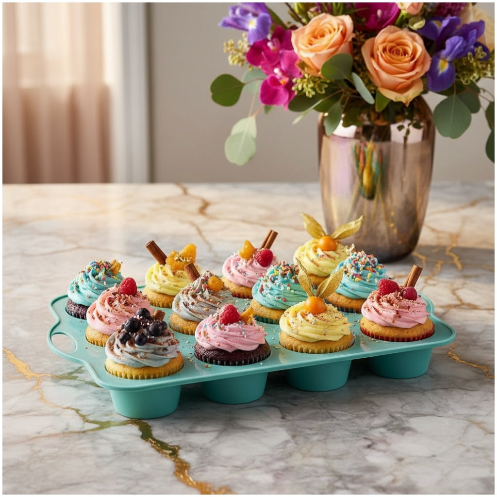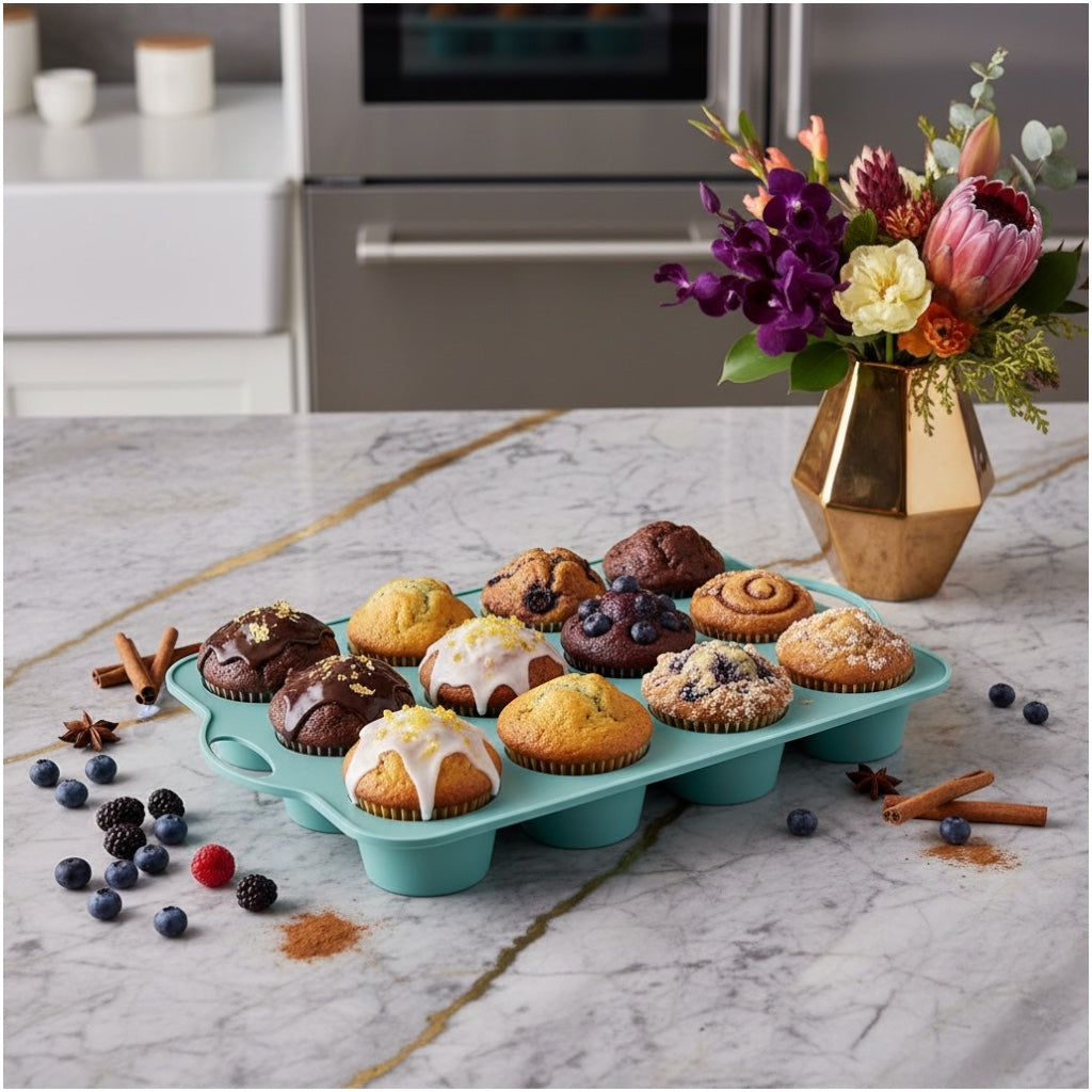 Bake effortlessly with this premium 12-cup silicone muffin and cupcake mold, designed for everyday baking and special occasions alike. Made from high-quality BPA-free silicone, this flexible tray releases baked goods smoothly without sticking, tearing, or greasing.