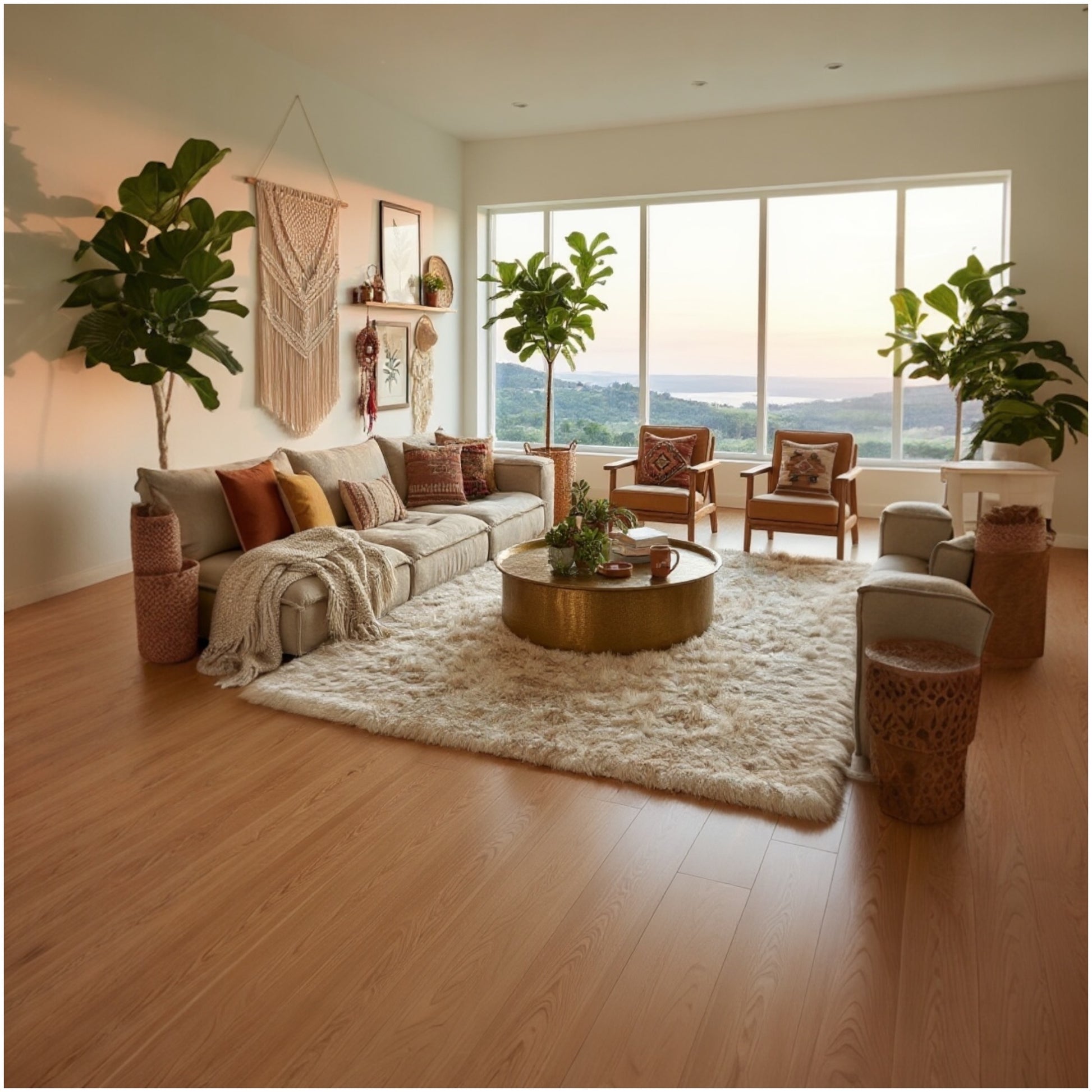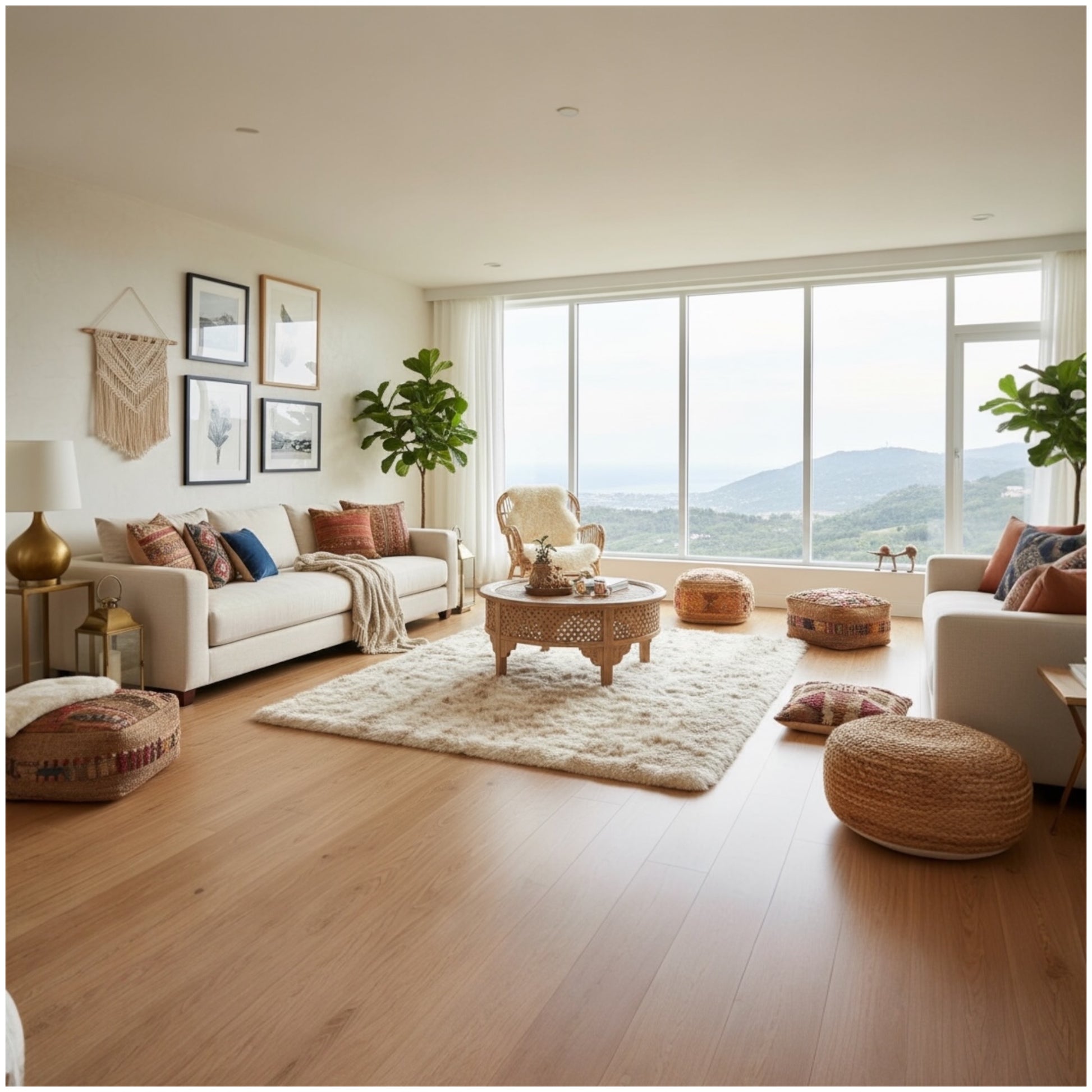 Boho: Natural wood coffee tables and woven baskets