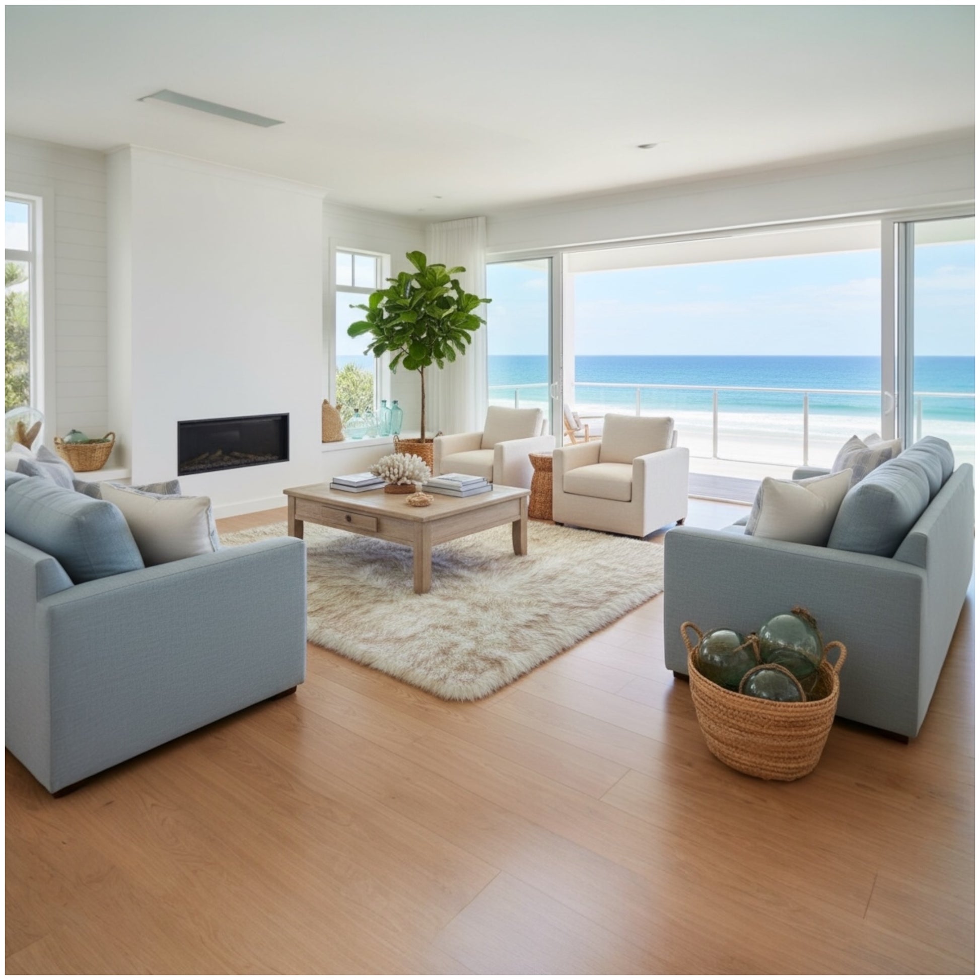 Coastal/Contemporary: Sheer or linen curtains in soft white or ivory